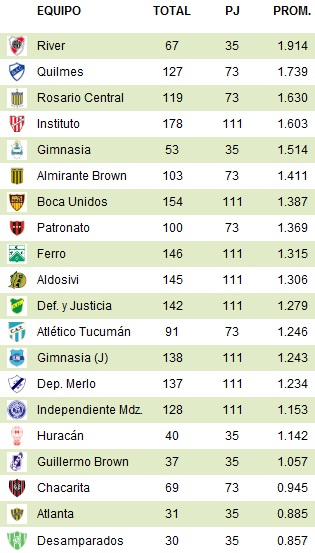 Таблица вылета (ole.com.ar):