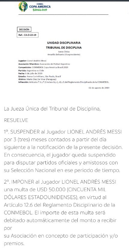 КОНМЕБОЛ принял решение дисквалифицировать аргентинского нападающего Лионеля Месси на срок три месяца за его комментарии о работе организации после Копа Америка 2019.