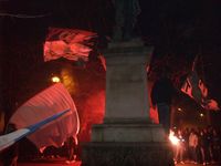 на Площади Свободы собралось куда больше людей, чем обычно – тысяч 8-10. Особенно отрадно было видеть совсем маленьких детей и восьмидесятилетних стариков – это символизировало, что у традиции есть будущее и что с возрастом любовь все-таки не проходит. Тифози пели гимны клуба, стадионные речевки, размахивали флагами, взрывали петарды, жгли файера – все, как всегда. Неожиданности начались позже, когда толпа двинулась в сторону виа Кола Ди Риенца (наверное, не случайное совпадение – этот персонаж в свое время много шуму в Риме наделал!), где размещалась полиция и карабинеры. И через минут десять праздник превратился в разборки, а ваш автор близко познакомился с действием слезоточивого газа, прямо скажем, не самые приятные воспоминания.