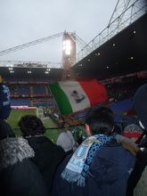 Стадио Луиджи Феррарис, построенный в английском стиле, – один из лучших в Италии. Не только потому, что трибуны расположены близко к полю, создавая иллюзию причастности, но и потому что стадион, как всегда, прилично заполнен, украшен и поет – слышно, несмотря на то, что гостевой сектор тоже отнюдь не молчит. Чтобы попасть на трибуну, огражденную навесной сеткой, пришлось вывернуть все содержимое рюкзака, развернуть флаг S.S. Lazio Supporters Kiev, который внимательно прочитали и одобрили, мол, лациали понравится (до меня пытались пройти албанцы с розой своей сборной – не пропустили, "лациали не понравится") и еще позволить себя основательно прощупать. Как же разительно отличается от Стадио Олимпико, где ты чувствуешь себя хозяином, и тебе даже в сумку не особо заглядывают!