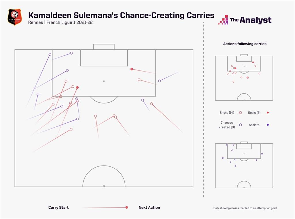 Этот стиль не изменился и в новом сезоне в его новом клубе: он нанес 23 удара по воротам, после того как самолично протащил мяч – второй лучший результат в Лиге 1 – один раз каждые 43 минуты. Единственный игрок, сыгравший 900+ минут и показавший лучший результат, – это Килиан Мбаппе (каждые 42 минуты). Неплохая компания.