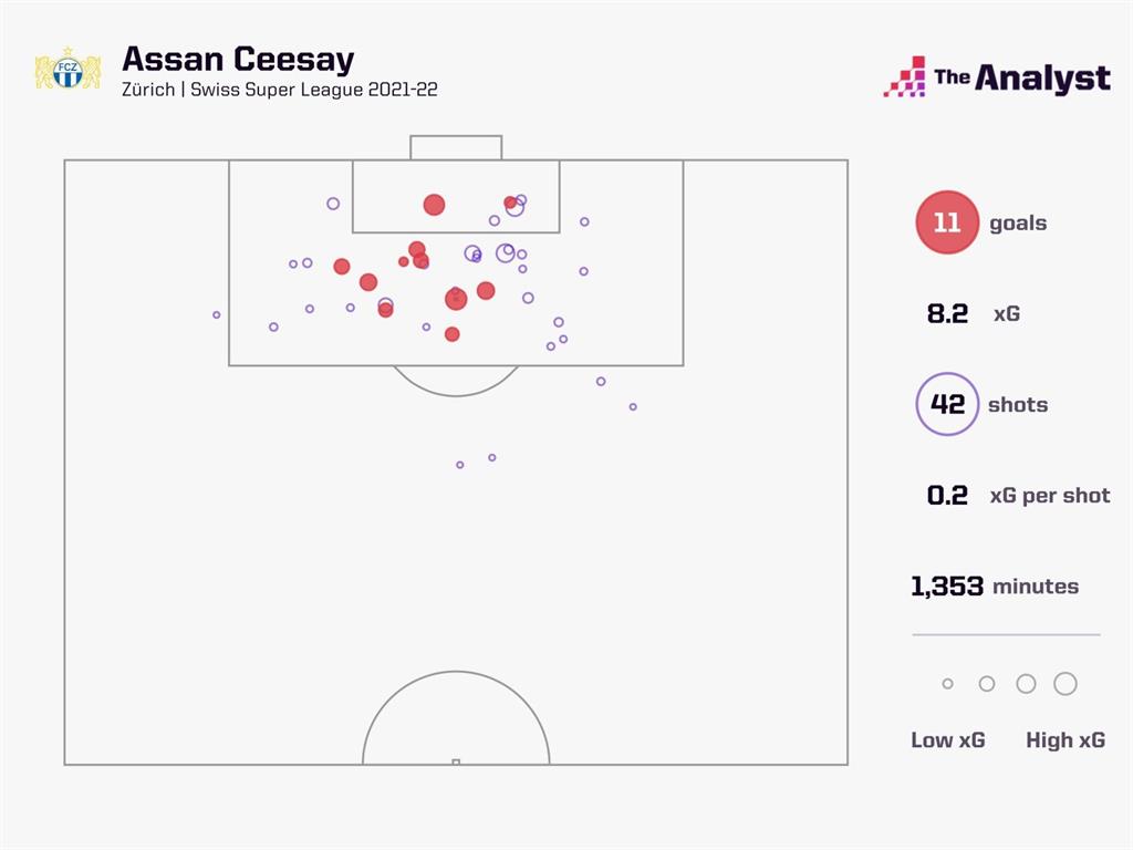11 голов в 17 матчах чемпионата в этом сезоне – это больше, чем за четыре предыдущих сезона вместе взятых (9 в 83 матчах). Сейчас Сисей забивает гол в среднем каждые 123 минуты, а его лучший показатель за предыдущие четыре сезона в швейцарской Суперлиге – 236 минут на гол. Факт: сейчас 27-летний игрок пребывает в своей лучшей форме в карьере.