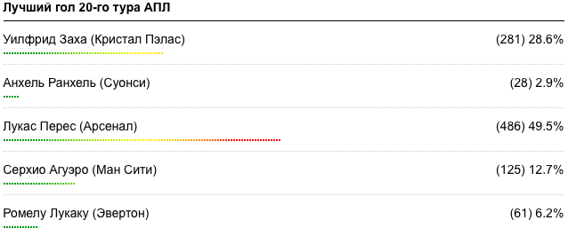 Украинские болельщики отдали большинство своих голосов за точный выстрел форварда Арсенала Лукаса Переса. За него проголосовала почти половина респондентов (49,5 %).