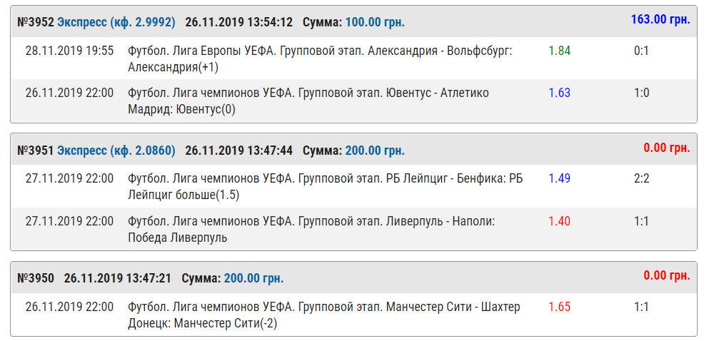Небольшое утешение. Ювентус обыграл Атлетико, что принесло нам плюс в экспресс, а Александрия минимально уступила Вольфсбургу, а это возврат. Наш двойник зашел с коэффициентом 1,63. Неплохо, но после провальных матчей ЛЧ радости абсолютно нет.
