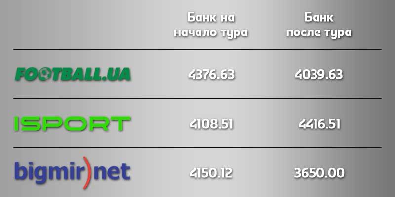 В очередном туре нашего с Parimatch проекта мы вернулись туда, где были пару туров назад. Очень надеемся исправиться на выходных. Что касается наших соперников, то Isport.ua показал отличный результат и вырвался на первое место, а Bigmir)net из-за матча Шахтера ушел в минус.