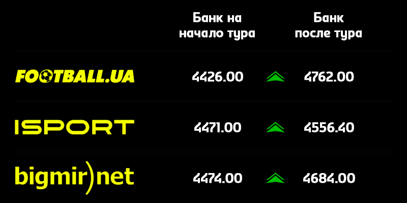 Во втором туре нашего с Parimatch проекта мы показали отличный результат и вышли на первое место в нашей гонке. Постараемся продолжать в том же духе и надеемся, что матчи еврокубков нас не подведут! Теперь давайте посмотрим как там дела у Isport.ua и Bigmir)net.