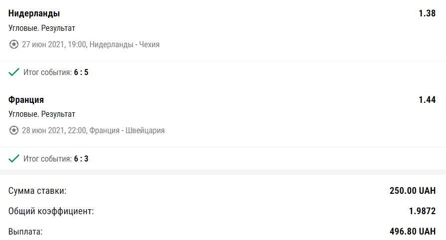 По второй ставке у нас тоже плюс, хотя попереживать пришлось в обоих матчах. Нидерланды сделали себе отличный запас по угловым, но также быстро его растеряли и были близки к ничьей по этому показателю. Что касается французов, то команда Дидье Дешама долго запрягала, но все-таки сделала для нас нужный результат. А затем вылетела из турнира.