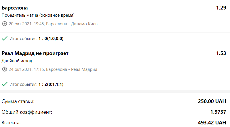 Взяли два матча Барселоны и она нас не подвела. В одном случае нам была необходима ее победа, но это та история, когда мы бы не расстроились в случае поражения ставки, ведь каталонцы играли против Динамо! Чуда не случилось. Во втором случае мы уже играли против Барселоны — мы были уверены, что каталонцы не смогут обыграть Реал. И тут чуда не случилось.