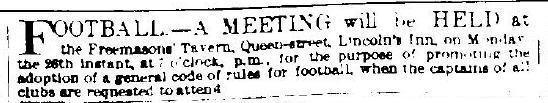 «ФУТБОЛ – Встреча, посетить которую предлагается капитанам всех футбольных клубов, направлена на принятие общего свода футбольных правил, и состоится в таверне Фримэйсонс, по улице Куин-стрит, в Линкольнс-Инн, в понедельник 26-го числа, в 7 часов вечера».