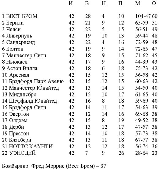 Вест Бромвич Альбион: Пирсон - Джо Смит, Пеннингтон - Ричардсон, Боусер, Макнил - Энди Смит, Крисп - Грегори, Бентли, Моррис. Секретарь-менеджер - Фред Эверисс