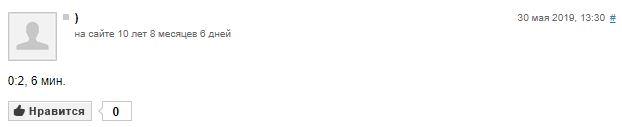Было оставлено 734 комментария. Матч, напомним, завершился со счетом 0:2. На такой результат поставили сразу 65 участников. Правда, никто из них не ожидал, что гол будет забит столь рано — на второй минуте. Несколько человек ставили на 9-ю минуту, еще парочка на 8-ю. Но ближе всех стал вот этот участник, зарегистрировавшийся под именем Роман и весьма необычным ником.