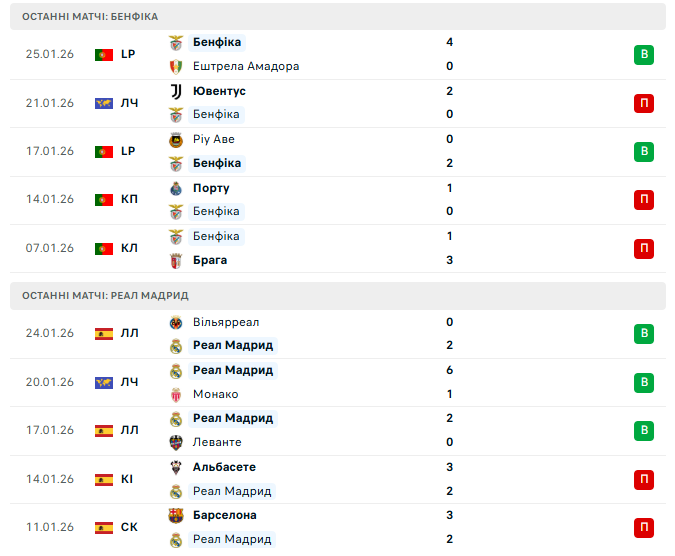 У восьмому турі основного раунду Ліги чемпіонів УЄФА лісабонська Бенфіка прийматиме мадридський Реал. Португальці перебувають за крок від вильоту й не мають права на помилку, тоді як іспанський гранд прагне напряму вийти до плей-оф, уникнувши зайвих нервів наприкінці етапу.