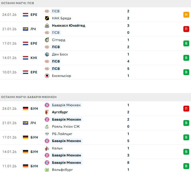 Однак до матчу в середу вони підходять після своєї першої поразки в Бундеслізі в сезоні-2025/26, програвши Аугсбургу (1:2), і це був лише четвертий матч за 30 ігор, коли їм не вдалося перемогти. Команда Венсана Компані також забивала як мінімум два голи в десяти матчах до зустрічі з Аугсбургом, хоча, як і раніше, посідає перше місце в Бундеслізі з 50 очками, на вісім більше, ніж у дортмундської Боруссії.