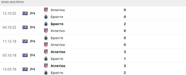 Останні зустрічі між Брюгге та Атлетіко свідчать про напружене суперництво: остання зустріч завершилася нульовою нічиєю, а у чотирьох попередніх матчах кожна команда здобула по одній перемозі, а дві гри закінчилися з однаковими цифрами на табло.