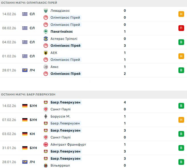 В середу, 18 лютого, Олімпіакос та Баєр Леверкузен на стадіоні Караіскакіс у Греції відкриють двоматчеве протистояння за вихід до 1/8 фіналу Ліги чемпіонів.