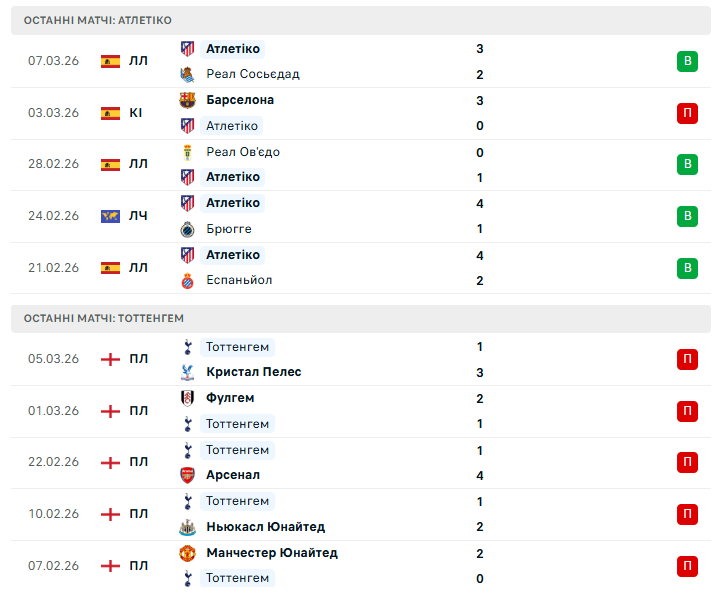 Втім, у внутрішніх змаганнях ситуація для "шпор" залишається катастрофічною. Команда Ігора Тудора переживає затяжну серію невдач і не може перемогти в Прем’єр-лізі вже протягом одинадцяти матчів. Останнім ударом стала поразка від Крістал Пелес, після якої тиск на хорватського наставника лише посилився. Проте у Лізі чемпіонів Тоттенгем все ще виглядає конкурентним — зокрема, завдяки організованій грі в обороні та швидким переходам у атаку.