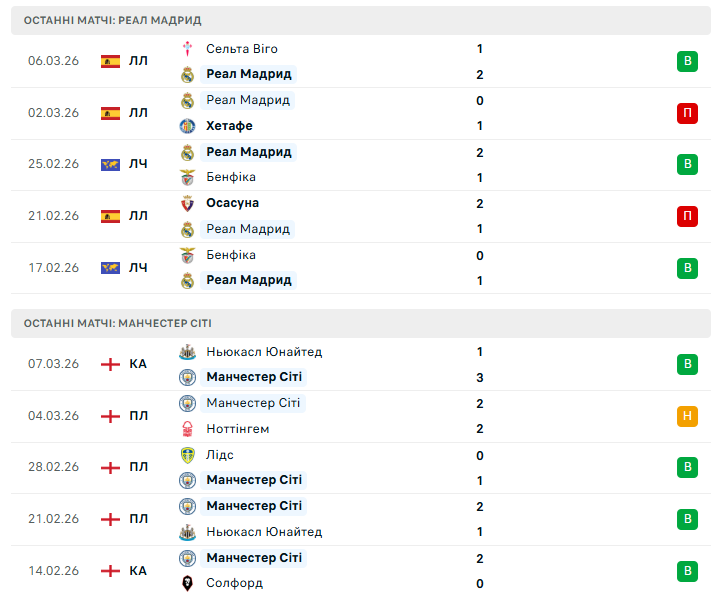Манчестер Сіті цього сезону виглядає стабільніше. Команда Хосепа Гвардіоли набрала 16 очок на основному етапі Ліги чемпіонів і напряму вийшла до 1/8 фіналу, зокрема здобувши перемогу саме над Реалом у Мадриді (2:1). Загалом англійці виграли п’ять матчів у цій стадії турніру, демонструючи традиційний контроль м’яча та ефективність у завершенні атак.