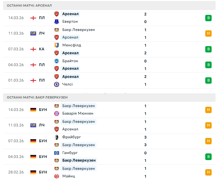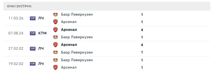 Минулого вікенду леверкузенці зуміли вистояти у складному матчі проти Баварії (1:1), продемонструвавши характер і організованість. Водночас виїзна форма команди залишає простір для сумнівів: лише чотири перемоги в десяти останніх гостьових матчах. До того ж історія особистих зустрічей також не на боці німецького клубу — Баєр ще жодного разу не перемагав Арсенал в офіційних єврокубкових матчах.