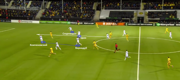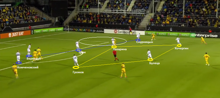 Обратите внимание на расстояние между защитниками Зари. Снурницын встречает игрока на фланге, его никто не страхует. Цвек остается в своей зоне, Назарина лишь в последний момент реагирует на подключение правого инсайда и соответственно оставляет открытым центральную зону. У Зари на данном этапе практически нет нормальной структуры в позиционной обороне. Своими быстрыми смещениями игроки норвежского клуба постоянно открывали зоны. Фулбеки хозяев подключались к атакам. Смещаясь в полупространство. Это добавляло вариативности атакам.