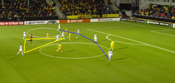 На скриншоте выше – эпизод, в котором прессинг команды Кнудсена привел ко второму голу. Это системный момент. Благодаря проактивным методам обороны "желтые" забили два гола. После того, как Заря теряла мяч под давлением, норвежцы очень быстро переходили в атаку, постоянно используя вертикальный вектор. Как правило, полупространства были открыты, а защитники без должной поддержки хавбеков вынуждены были растягиваться и невольно искажать линию.