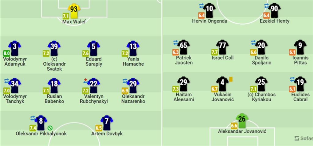 У гостей найвищій бал отримав центральний півзахисник Ісраель Коль — 7,7. Найгірший гравець зустрічі вінгер Йоанніс Піттас — 6,1.
