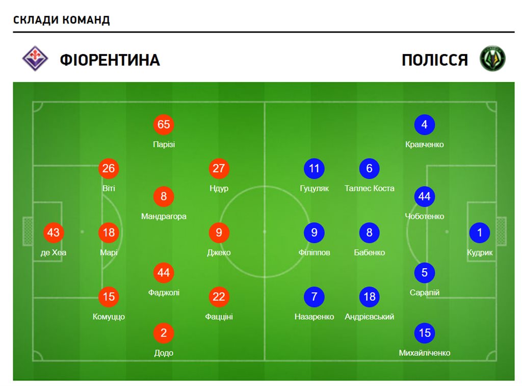 Ліга конференцій 28 серпня 2025, 20:44 Фіорентина — Полісся: стали відомі стартові склади Матч розпочнеться о 21:00 за київським часом. Фіорентина — Полісся, facebook.com/fcpolissya 28 серпня 2025, 20:44 В рамках матчу-відповіді відбору до основного етапу Ліги Конференцій, Фіорентина на своєму полі прийме Полісся. Стали відомі стартові склади: Слідкуйте за текстовою онлайн-трансляцією матчу на Football.ua. Нагадаємо, що в першому матчі "фіалки" здобули впевнену перемогу з рахунком 3:0. Олександр Caвeльєв Football.ua всі статті автора Команди Полісся Фіорентина Джерела ФК Полісся ФК Фіорентина Facebook