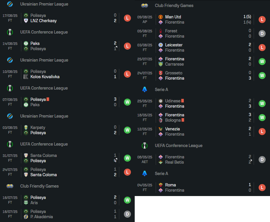 А Фіорентина при цьому й у першій стадії Кубка Італії не грала минулими вихідними, тож фактично суперник Полісся буде без ігрової практики. Виставкові матчі проти Лестера (0:2), Ноттінгем Форест (0:0) та Манчестер Юнайтед (1:1, поразка в серії пенальті) — це, звичайно, престижно, але навряд чи ігри два тижні тому мають суттєвий вплив на підготовку команди. А італійці дуже важко подекуди входять до сезону. Тим паче, що ще й першу гру доведеться грати не вдома. Тож Полісся цілком може зачепитись і за певну кількість очок для нашої країни.