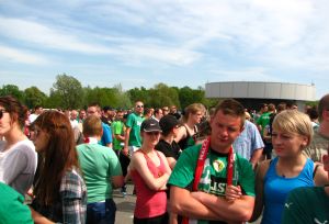 Как и в случае с познаньскими болельщиками, фаны Шленска были практически поголовно облачены в клубные цвета - зеленый и белый. Исключение составляли преимущественно дамы бальзаковского возраста, пришедшие на стадион лишь для того, чтобы "посмотреть", да и то наверняка после многочасовых уговоров со стороны мужей. Путь до стадиона пешком занял около двадцати минут, хотя желающие могли легко добраться до арены на трамвае - остановка этого вида транспорта расположена в паре минут ходьбы от главного входа на территорию стадиона. Первоочередным заданием было обзавестись билетами на игру. Каким же сложным оно оказалось впоследствии - никто не подозревал. А пока мы фотографировались и неторопливо рассматривали живописные окрестности у арены - небольшой мостик, речушка, везде зелено. Весна.