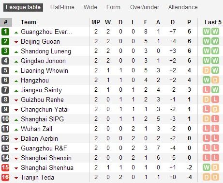 Несмотря на то, что продолжает забивать Якубу Айегбени, без очков идет второй Гуанчжоу – Фули. Оборона команды бразильца Сержио Фариаса напоминает решето – семь пропущенных голов в двух матчах. В этот раз Фули капитулировал в гостях у Ханчжоу. Стоит отметить еще и победу Шанхай Шеньхуа, который уже в ближайшем туре может выйти в «плюс» в случае еще одного успеха – после виктории в шанхайском дерби с Шеньксинь благодаря раннему результативному удару от аргентинца Патрисио Торансо они отыграли три очка из пяти штрафных за участие в договорняках.