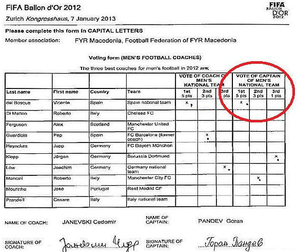 ФИФА предъявила доказательство, что Горан Пандев на самом деле голосовал за Висенте Дель Боске, а не за Жозе Моуриньо в выборах лучшего тренера 2012 года.
