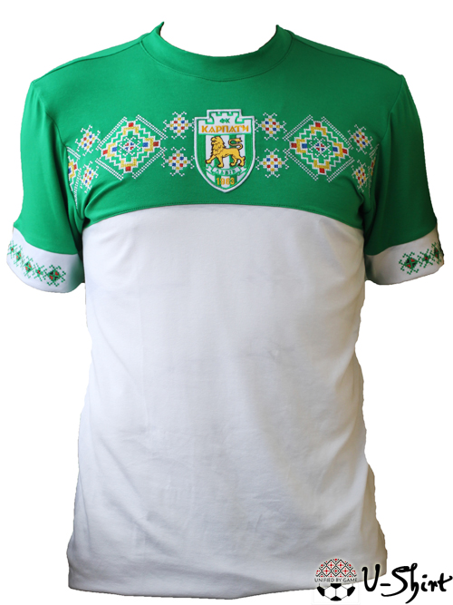 Футбольна вишиванка U-Shirt Карпати виконана у фірмових зелено-білих кольорах. Особливість дизайну — стилізований орнамент Галицької вишивки, яка нанесена на грудях і рукавах футболки. У центрі композиції розташовується клубна емблема. Вишивка в поєднанні з емблемою надає футболці довершений, вишуканий вигляд.