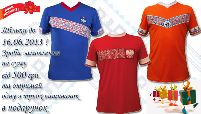 По-друге, унікальна пропозиція, яка діє тільки до 16 червня. Купуючи будь-який товар в нашому магазині на загальну суму від 500 грн. ви отримуєте в подарунок одну з трьох вишиванок!