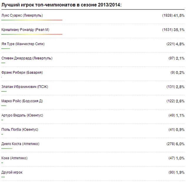 Наибольшее количество голосов — 1927 (41,5%) — ушло к нападающему Ливерпуля Луису Суаресу, который на данный момент является не только лучшим бомбардиром английской Премьер-лиги, но и лучшим ассистентом.