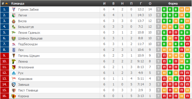 Тройка лидеров в лице Гурника Забже, Легии и Вислы очков не теряла. В Забже гостили одноклубники из Лежны и рассчитывать более чем на ничью им было очень сложно. Дубль Мадея во втором тайме этот тезис только подтвердил, и хозяева поля продлили свое нахождение на вершине турнирной таблицы как минимум на неделю.