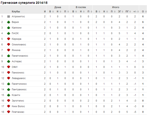 На вершине табеля о рангах расположились достаточно сенсационные гости: Верия и Атромитос, которые пока после двух стартовых туров идут со стопроцентным показателем. Что интересно, то оба коллектива выигрывают у соперников с преимуществом с разницей в один мяч. Команда из города Перистери вообще лучшая на данный момент в стране: два матча, шесть очков, два забитых гола, ноль пропущенных. Стоит напомнить, что в прошлом сезоне Атромитос начинал приблизительно так же, однако под конец «забуксовали», заняв почетное для себя четвертое место.