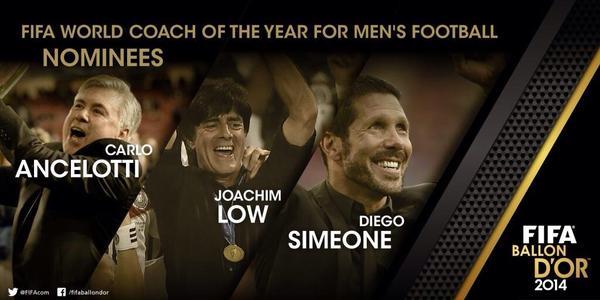 Как сообщает официальная Твиттер-страница ФИФА, за звание лучшего тренера в этом году будут бороться Карло Анчелотти, Йоахим Лёв и Диего Симеоне. Итальянец, напомним, привел Реал к победе в Лиге чемпионов, немец выиграл чемпионат мира со своей сборной, а аргентинец навел шороху с Атлетико, выиграв чемпионат Испании и дойдя до финала Лиги чемпионов.