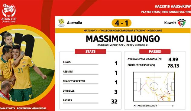 Открывать Кубок Азии хозяевам пришлось матчем с представителем четвертой корзины и одним из ожидаемых аутсайдеров группы — Кувейтом. Постекоглу решил обойтись без сюрпризов и выставил на матч традиционную схему 4-5-1, которая наигрывалась в течение всего года. Место на острие атаки было выделено опытнейшему Тиму Кэхиллу — живой легенде Соккерус.