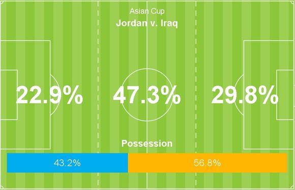 В другом матче группы D между Иорданией и Ираком с самого начала ожидалась более напряженная борьба. Команды близки друг к другу по рейтингу и считались главными конкурентами в борьбе за вторую позицию в квартете. Победитель из этого поединка становился явным кандидатом на выход в плей-офф. С первых минут матча сделали ставку на длительный контроль мяча иракцы и позиционные атаки, тогда как Иордания пыталась действовать на контратаках. Однако, большого числа опасных моментов команды не создавали.