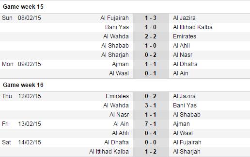 В чемпионате ОАЭ за прошедшую неделю состоялось два тура. Весьма успешными они оказались для Аль-Джазиры, которая одержала две уверенные победы (3:1 над Аль-Фуджайрой и 2:0 над Эмирейтс). В каждом из матчей вновь забивал Али Мабхут, который набрал отличную форму и стал лучшим бомбардиром прошедшего Кубка Азии. Одним голом отличился и Мирко Вучинич, сохраняющий за собой лидерство в гонке бомбардиров.