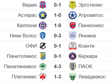 P.P.S. Ники Волос снялся с чемпионата – Яннине засчитали техническую победу, матч Пантракикос – Олимпиакос перенесен из-за плохой погоды.