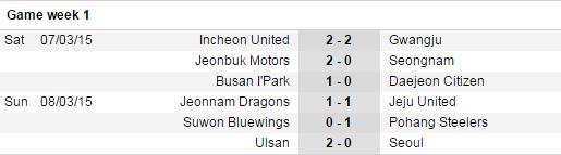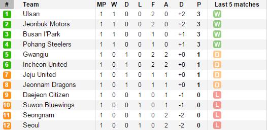 В первый игровой день K-лиги действующий чемпион Чонбук Моторз благодаря дублю Эду без проблем одолел Соннам Ильва. Сперва на 38-й минуте бразилец реализовал пенальти, разведя голкипера и мяч по разным углам. А под занавес матча девятый номер хозяев переправил мяч в сетку, удачно отработав на подборе. За всю игру гости лишь раз смогли создать по настоящему опасный момент. В середине второго тайма Ким отлично исполнил штрафной, но голкипер Чонбука достал мяч из нижнего угла ворот. В остальное время матча хозяева были ближе к тому, чтобы в очередной раз забить, чем хоть раз пропустить.