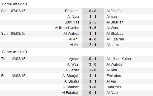Следующий тур начался с победы Аль-Джазиры над Аль-Ахли – это случилось в четверг. Здесь Вучинич открыл счет с передачи Питроипа, а спустя десять минут Мабхут уверенно реализовал пенальти. На следующий день свой матч проводил Аль-Айн, ему противостояла девятая команда чемпионата, Аль-Дхафра. Середняк уже на десятой минуте вышел вперед благодаря голу Диопа, а отыграться гостям удалось только в середине второго тайма, сделал это Кембо-Экоко после паса Стоха. На большее Аль-Айна не хватило – ничья 1:1. Благодаря этому Аль-Джазира сократила отставание до четырех очков и за семь туров до конца все еще имеет шансы на чемпионство.