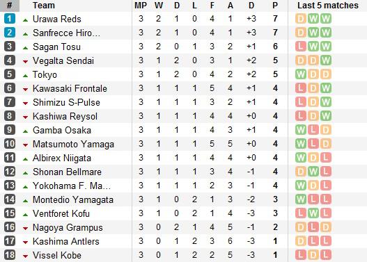 В третьем туре J-лиги состоялся матч команд, которые в нынешнем чемпионате еще не теряли очков. Хиросима принимала на своем поле Ураву Редс. Активнее встречу начали хозяева, которые не реализовали несколько великолепных возможностей. Правый фланг защиты гостей проваливался раз за разом. Сперва Касива прошел по бровке и отдал пас немного назад на вбегавшего в свободную зону партнера, но выстрел Морисаки с 12-ти метров пришелся рядом с дальней штангой. Через несколько мгновений Чайима убегал по той же боковой линии на свидание с двумя защитниками: нападающий, не сближаясь с соперниками, пробил из-за пределов штрафной обводящим ударом в дальний угол – мяч едва не попал в девятку. У Красных также был неплохой момент, но Хасимото с линии вратарской умудрился послать мяч на трибуну в районе углового флажка.