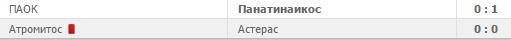 В параллельной встрече встречались два аутсайдера. Хоть по турнирной таблице этого не видно, но даже в очной битве они не смогли выявить победителя, который бы обошел ПАОК. Благодаря дополнительному баллу в предматчевых раскладах чуть предпочтительнее выглядел Астерас, гостивший в Перистери.