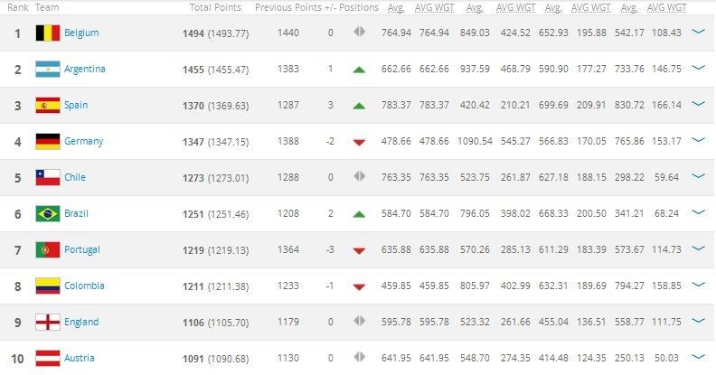 Первую строчку продолжает занимать сборная Бельгии. Со второй строчки на четвертую опустила сборная Германии, а ее место заняла Аргентина. Третья позиция у сборной Испании.