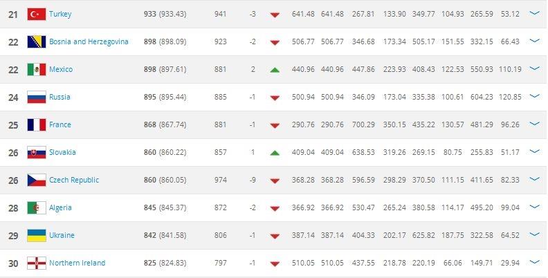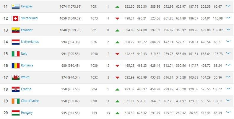 Большой прорыв среди команд топ-30 сделала сборная Эквадора (плюс 8), а также Венгрия (плюс 13). Теперь эквадорцы на 13-м месте, а венгры — 20-ые.
