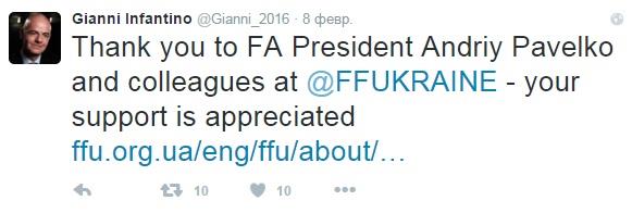 Генеральный секретарь УЕФА Джанни Инфантино выразил свою признательность Федерации футбола Украины за готовность поддержать его кандидатуру на предстоящих выборах президента ФИФА.