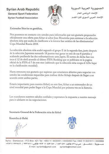 "Связались с вами, чтобы проинформировать, что мы хотели бы сделать Жозе Моуриньо официальное предложение принять сборную Сирии. Мы готовы договориться с вами об условиях, необходимых для подписания контракта".