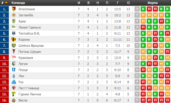 Поговорим о лидерах чемпионата Польши. После прошлого тура на вершине, причем с наибольшим количеством пунктов в своем активе были игроки Лехии Гданьск. Но 7-й тур перетасовал все карты, ведь теперь целых пять команд имеют равное количество очков вверху турнирной таблицы, а недавний фаворит, Лехия, из-за рейтинга забитых и пропущенных оказалась лишь на четвертой строчке. Первое место временно занимает Ягеллония, но говорить об этом громко не стоит, любая осечка будет стоить многого. Сама же команда из Гданьска в этом туре не смогла справиться с сопротивлением Тер