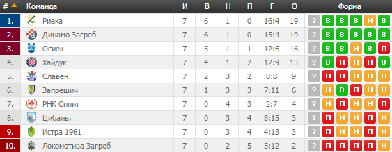 Как ни крути, а новый сезон для загребского Динамо должен быть посложнее, чем предыдущий. Команда отобралась в группу Лиги чемпионов, где будет противостоять Севилье, Лиону и туринскому Ювентусу. Глядя на это, их главный конкурент в нынешнем сезоне, Риека, наверняка попытается воспользоваться сложным графиком динамовцев и попытаться оторваться от них в турнирной таблице. На данный момент игроки Риеки идут просто отлично. В прошлом туре был обыгран Хайдук, а в этом игроки с берегов Адриатического моря еще раз показали свое умение разбираться с середняками – был обыгран со счетом 2:0 Славен.